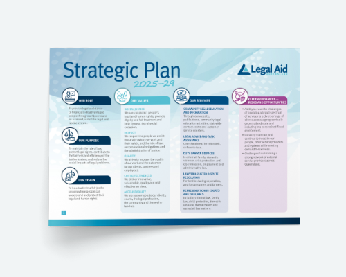 Legal Aid Queensland’s strategic objectives are determined by the Legal Aid Queensland Act 1997 (Qld). We are also committed to the principles of the National Access to Justice Partnership 2025–30. Legal Aid Queensland also contributes to the Queensland Government’s community objective of safety where you live.