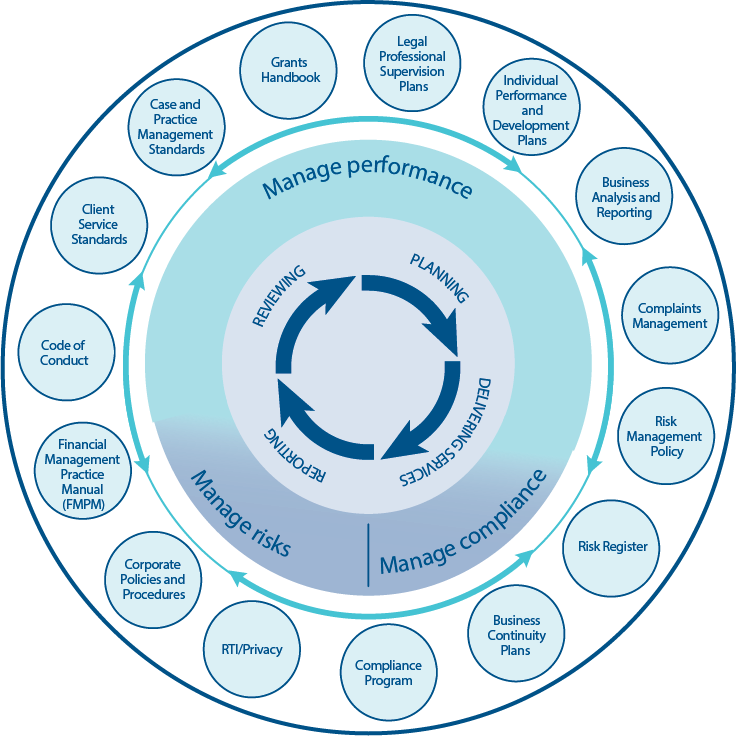 Legal Aid Queensland's governance framework demonstrates the strategies, policies and processes that ensure effectiveness in managing performance, managing risk, and managing compliance.