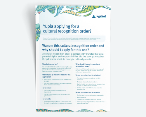 Find out what is a cultural recognition order, the eligibility requirements and how to apply. English and Yumplatok (Torres Strait Creole) versions available.