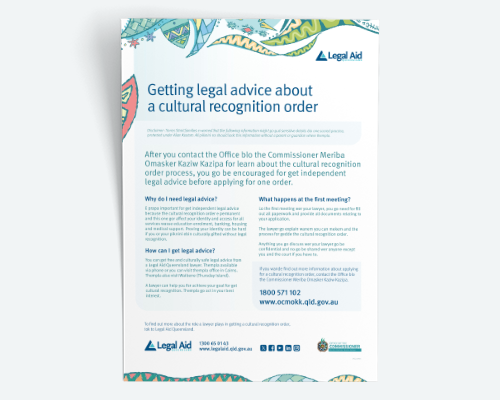 Find out how to access legal advice and what happens when you meet a lawyer to discuss a cultural recognition order. English and Yumplatok (Torres Strait Creole) versions available.