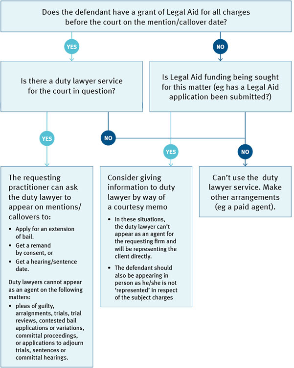 - The requesting practitioner can ask the duty lawyer to appear on mentions/callovers to: